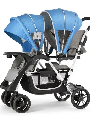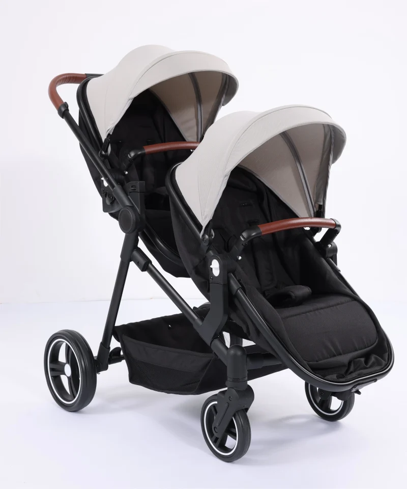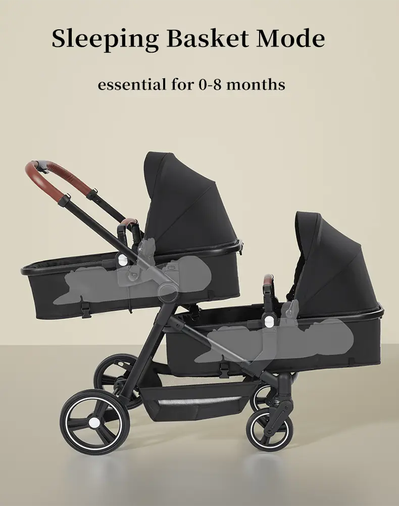Expertly Crafted for Newborns and Toddlers This double buggy for newborn and toddler UK features two independently configured seating positions. Your newborn travels safely in a fully reclined, lie-flat carrycot (suitable for overnight sleeping), while your active toddler enjoys a comfortable upright seat with adjustable footrests and multiple recline angles. Each child has their own protective sun canopy, ventilation system, and personal space.